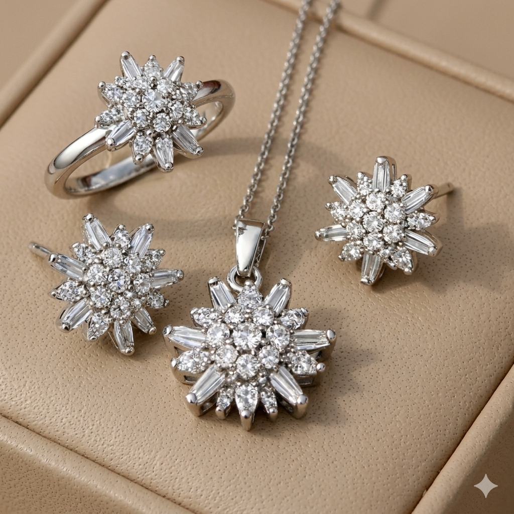 Elegant silver snowflake crystal locket set featuring a sparkling pendant necklace, matching stud earrings, and a ring. Designed with high-quality crystal stones and a premium silver finish, this stylish jewelry set adds a luxurious sparkle to any outfit. Perfect for parties, weddings, daily wear, and gifting. Lightweight, durable, and timeless—an ideal choice for modern women who love elegant fashion jewelry.